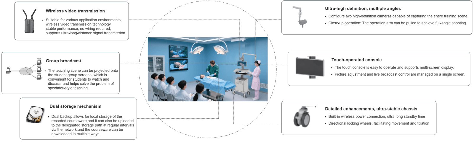The teaching‑and‑training cart is a portable demonstration platform for diverse settings—classrooms, meeting rooms, training rooms, workshops, operating rooms, and medical schools. It supports training, live surgery, rebroadcasts, demonstrations, and surgical video recording. Setup is simple and usage flexible. The camera’s main boom rotates 360°, and cable routing runs through the arm for neat aesthetics. Medical‑grade white steel‑aluminum construction suits educational and clinical scenarios.