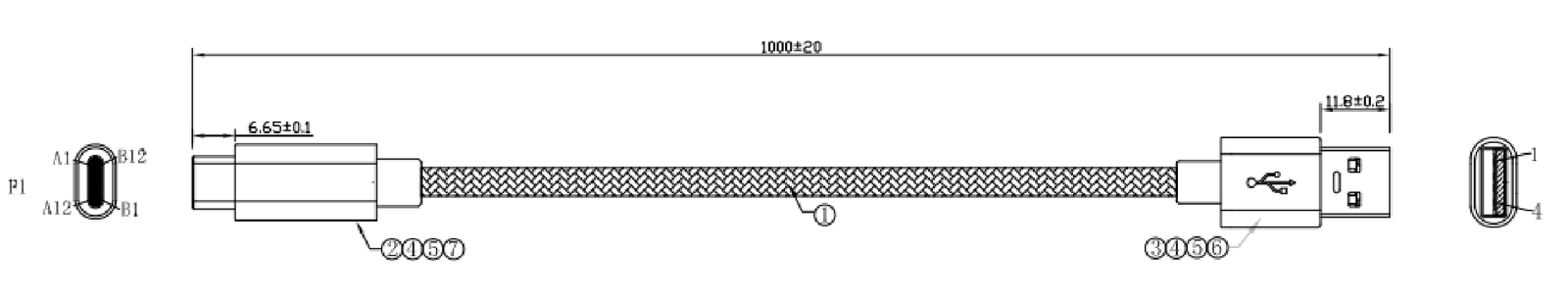线材规格 1P +2C+AL黑色编网,OD4.5MM,长度 1000±20mm